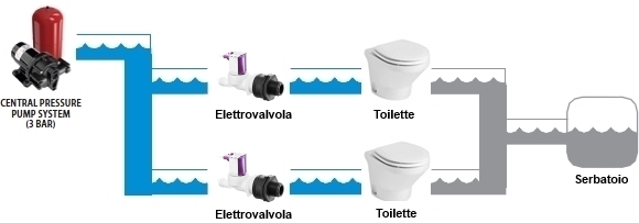 - Ogni toilette ha un’elettrovalvola dedicata, che viene alimentata elettricamente dal pannello di controllo